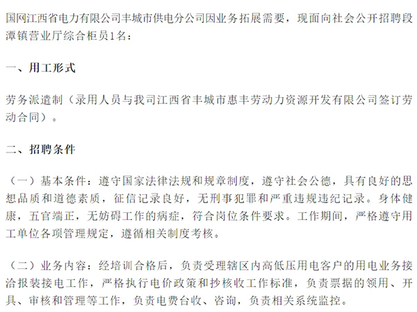 國網江西省電力有限公司豐城市供電分公司因業務拓展需要,現面向社會公開招聘段潭鎮營業廳綜合柜員1名:一、用工形式勞務派遣制(錄用人員與我司江西省豐城市惠豐勞動力資源開發有限公司簽訂勞動合同)。二、招聘條件(一)基本條件:遵守國家法律法規和規章制度,遵守社會公德,...